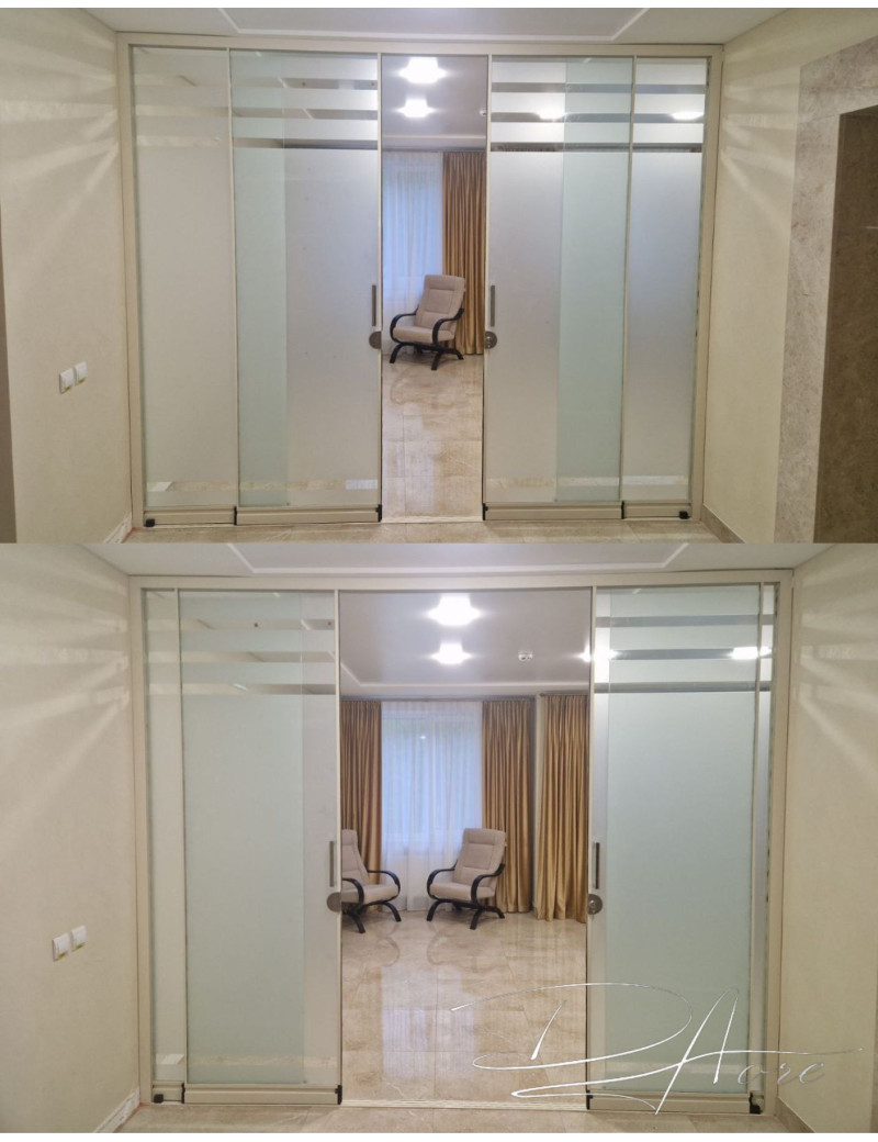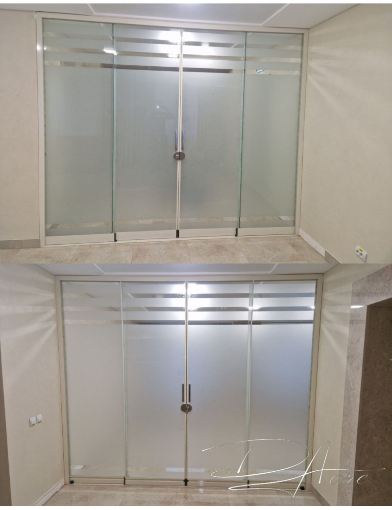 Алюмінієві перегородки з чотирьох частин дозволяють зонувати простір гнучко: відкрити частину або повністю зрушити двері вбік. Це практичне та стильне рішення для тих, хто цінує відкритість і функціональність.
