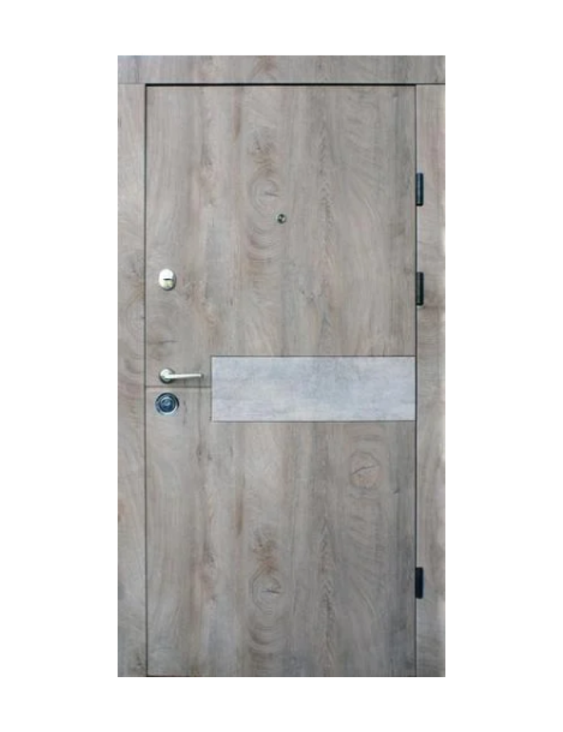 Фурнітура: втоплена броненакладка, антизрізи, ручка на розетці, вічко, 3 зовнішні петлі на 180°