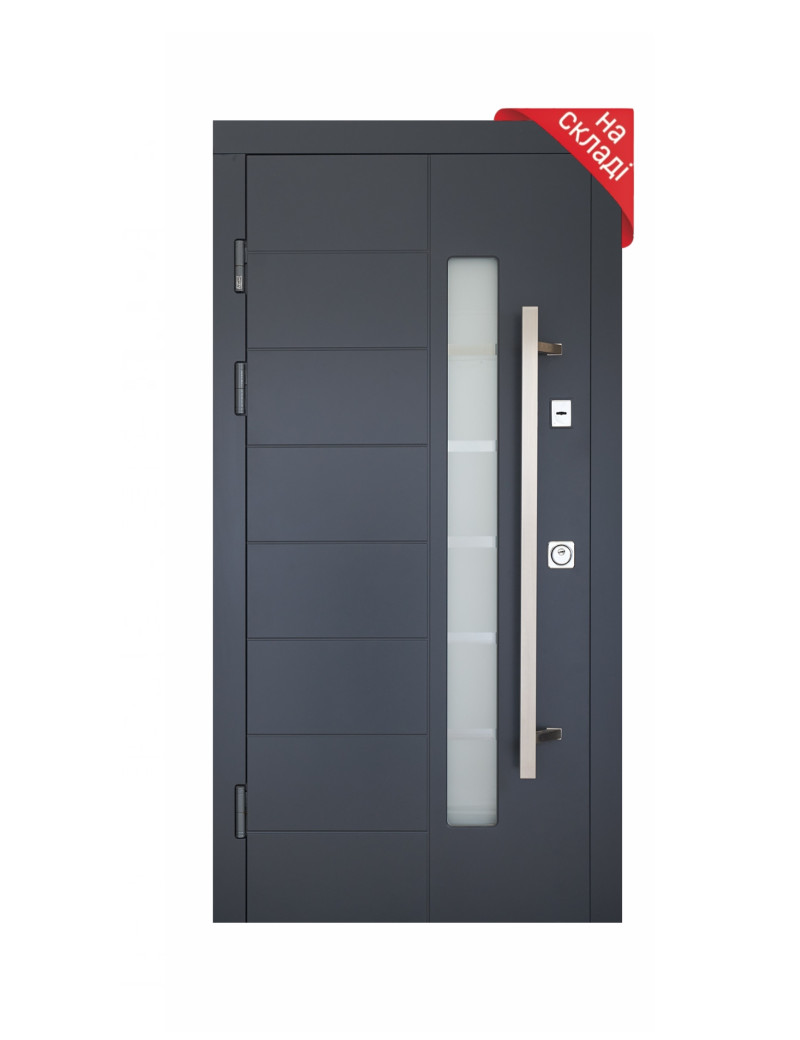 Дверне полотно виготовляється з металу 1,5 мм та укомплектовано двома МДФ накладками товщиною 16 мм ззовні та 10 мм всередині, що надає високий рівень тепло- та звукоізоляції.