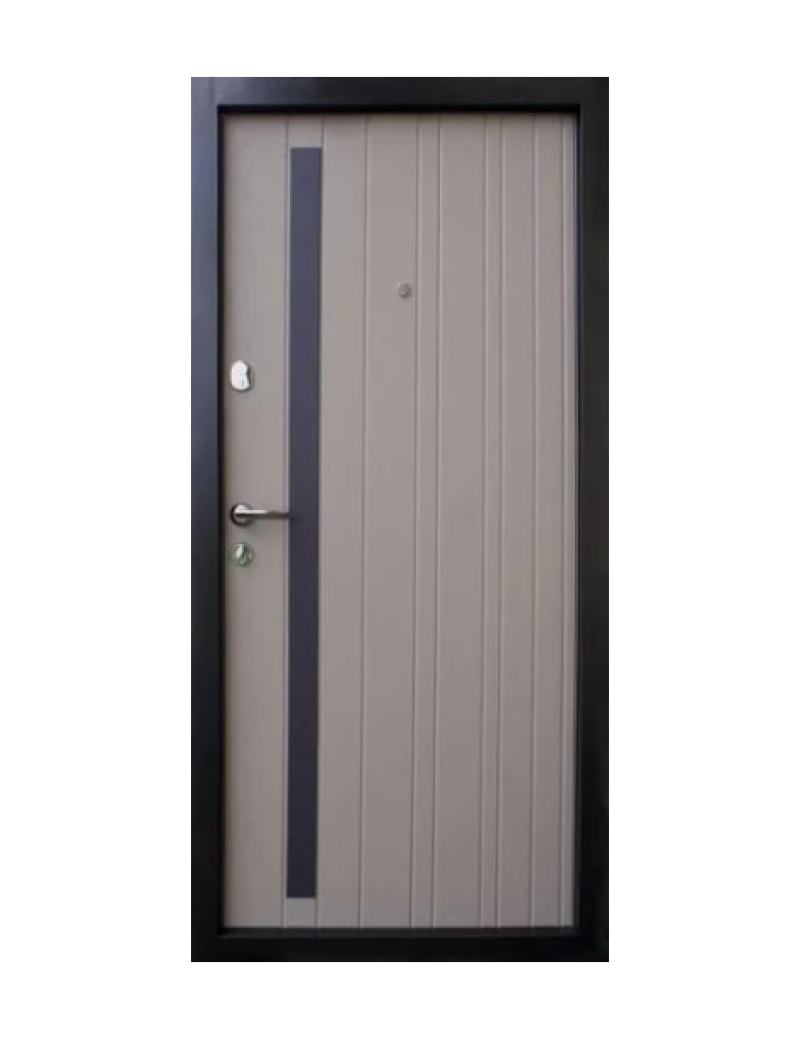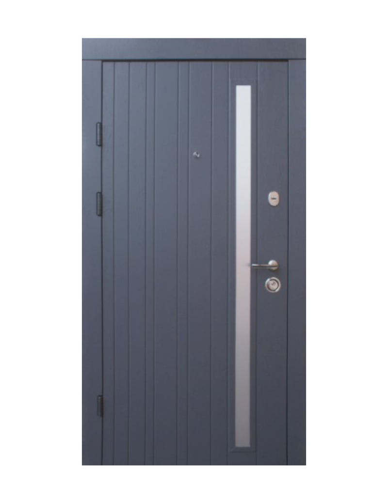 Фурнітура: втоплена броненакладка, антизрізи, ручка на розетці, вічко, 3 зовнішні петлі на 180°