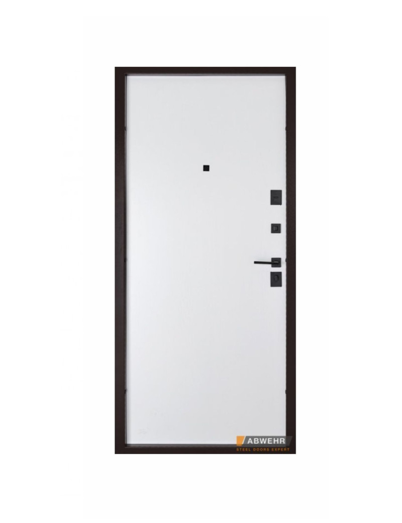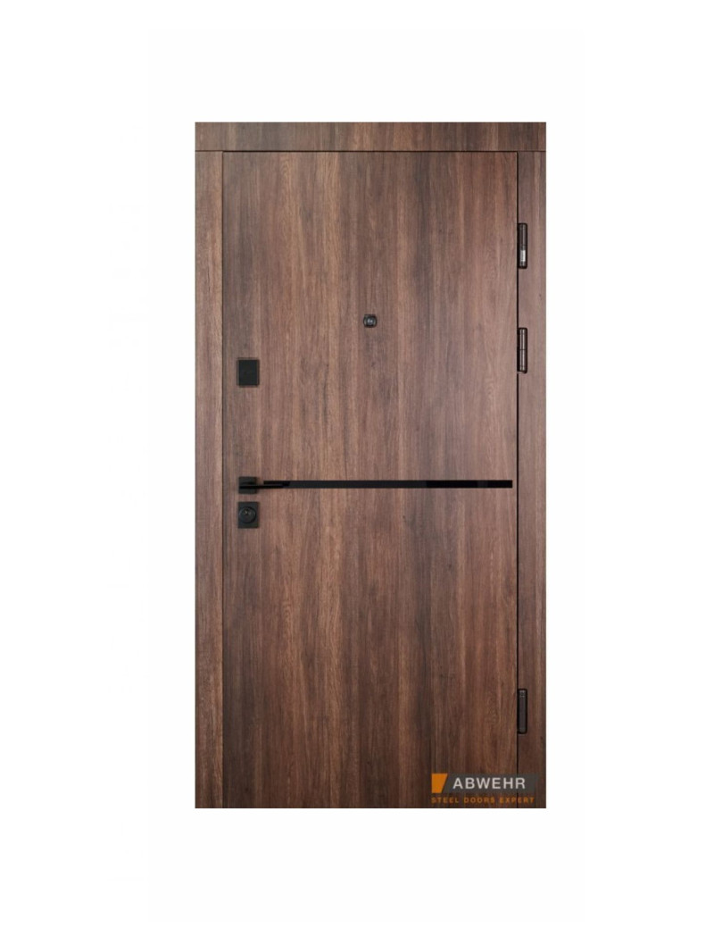 Дверне полотно виготовлене з міцного металу завтовшки 1,5 мм та доповнене двома МДФ-накладками (16 мм і 10 мм), що забезпечує ефективну тепло- та шумоізоляцію. Для підвищеної жорсткості конструкція дверей посилена трьома горизонтальними ребрами жорсткості, що гарантує її надійність і довговічність. Полотно та короб утеплені мінеральною ватою, яка ефективно зберігає тепло та захищає від шуму. Завдяки товщині полотна 90 мм, двері ідеально підходять як для приватних будинків, так і для квартир.
